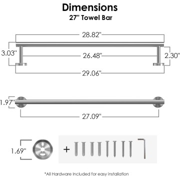 Towel Bar 27 Inch Center to Center, Brushed Nickel Bathroom Towel Rack 304 Stainless Steel, Wall Mounted Towel Holder for Bathroom, Includes Wall Mounting Hardware, Suitable for Bathroom, RV